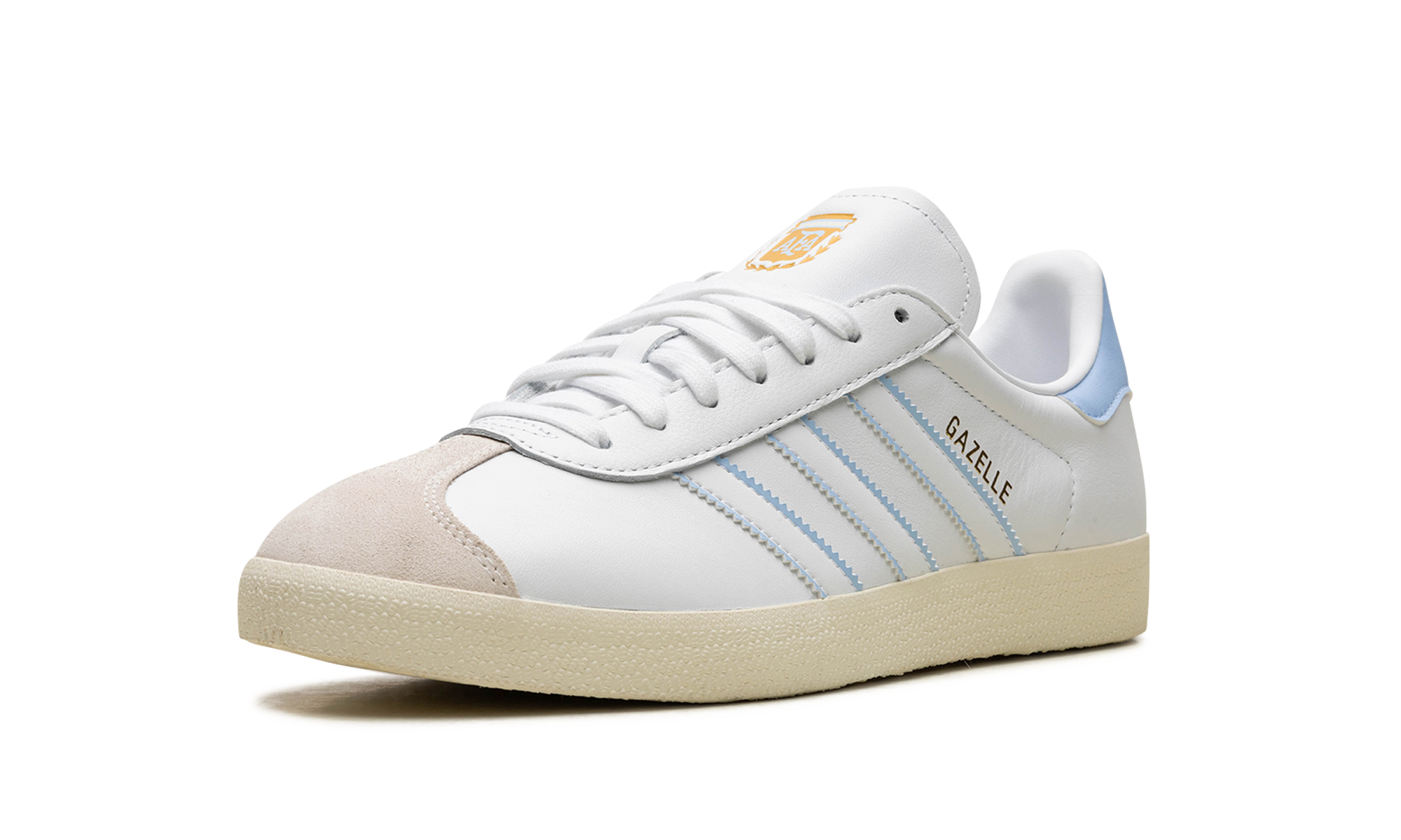 A atenção aos detalhes é imediatamente visível: a patilha traseira em pele apresenta o logótipo Trefoil em relevo, enquanto a inscrição 'GAZELLE' em lettering dourado decora o painel lateral. O emblema da Associação Argentina de Futebol na língua adiciona um elemento exclusivo que celebra a herança desportiva do país.