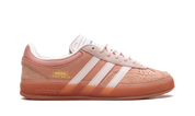 A sola de borracha semi-translúcida proporciona aderência excecional e um acabamento elegante. Autenticidade garantida - estas Adidas Gazelle Bad Bunny Wonder Clay são o equilíbrio perfeito entre conforto, estilo e design arrojado para quem quer destacar-se a cada passo.