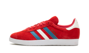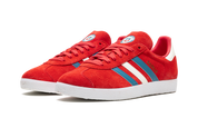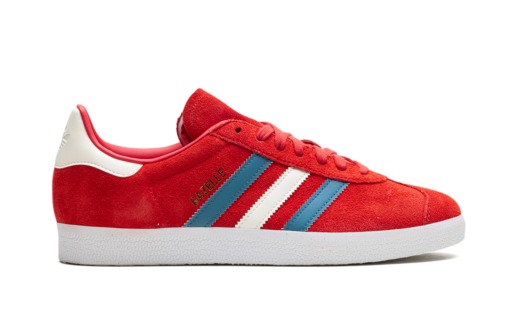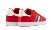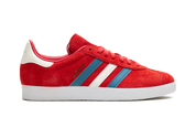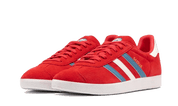 As sapatilhas apresentam uma parte superior em camurça escarlate vibrante, complementada por três riscas de couro em tons de cinza neutro e branco. O logótipo Trefoil em relevo no calcanhar e a inscrição 'GAZELLE' no painel lateral acrescentam um toque clássico da Adidas.