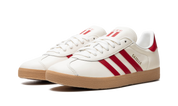 Celebra o futebol peruano com as sapatilhas Adidas Gazelle Peru. Este modelo exclusivo da 'National Team Retro Collection' apresenta um upper em pele creme com overlay tonal no T-toe, criando um visual sofisticado e atemporal.