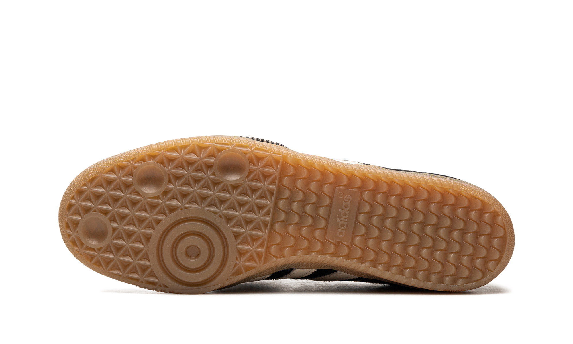 Estas sapatilhas exclusivas apresentam uma base em pelo pony preto texturizado, contrastando com detalhes em pele lisa creme nas três riscas laterais e lingueta dobrada. A construção premium inclui costuras decorativas e etiqueta co-branded, enquanto a sola semi-translúcida em borracha gum garante tração superior.
