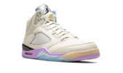 O upper em pele sail off-white é complementado por uma mistura vibrante de violet star, washed yellow e sail, criando um visual equilibrado mas marcante. Destaca-se a entressola em poliuretano com tecnologia Air em Violet Star, os spikes azuis com detalhes dourados e a sola translúcida com toques de laranja.