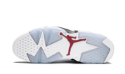 O design apresenta um upper perfurado em nubuck branco com detalhes vibrantes em carmine por baixo. A língua, branding, atacadores e calcanhar destacam-se com um vermelho intenso que adiciona personalidade ao look.