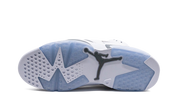 A parte superior em pele branca é complementada por painéis em nobuck cinzento, criando um contraste sofisticado e moderno. A sola exterior em azul translúcido e os fechos de atacadores a condizer com a marca Jordan completam o design icónico destas sneakers.