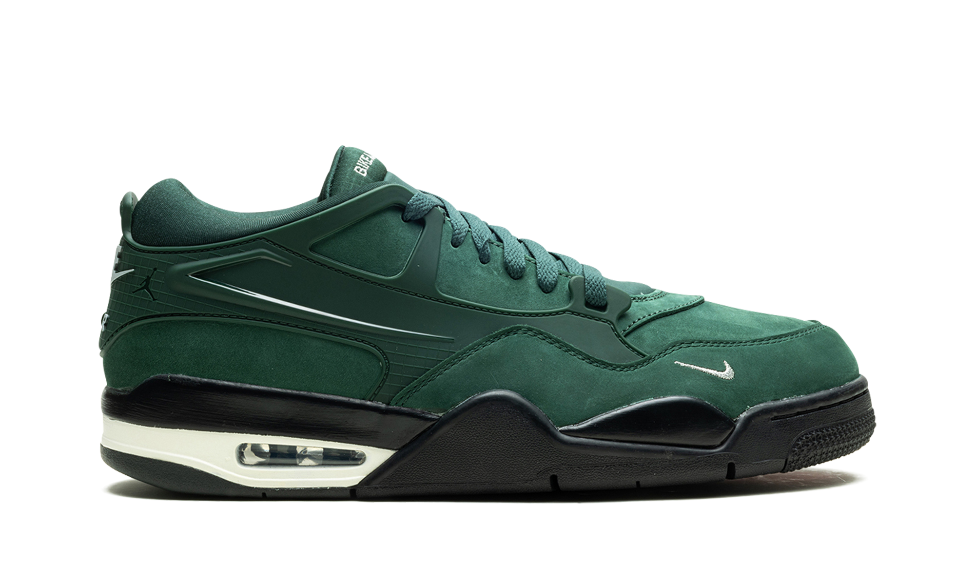A parte superior em camurça Pro Green é reforçada por uma estrutura em TPU, substituindo a rede original por um toque moderno. Um mini-Swoosh prateado adorna a biqueira, enquanto a marca 'Bike Air by Jordan' surge na lingueta. A entressola de dois tons, em preto e branco sujo, inclui amortecimento Air visível, garantindo conforto e apoio a cada passo.