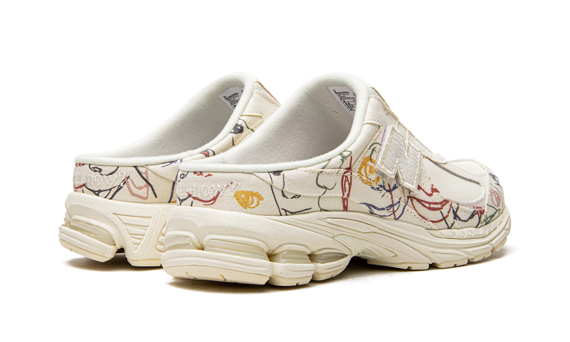 As ilustrações originais do artista cobrem a parte superior em lona esbranquiçada, exceto na biqueira e na lingueta perfurada. O logótipo 'N' é um patch de velcro removível, enquanto "What Now?" está bordado no calcanhar. Garanta já o seu par