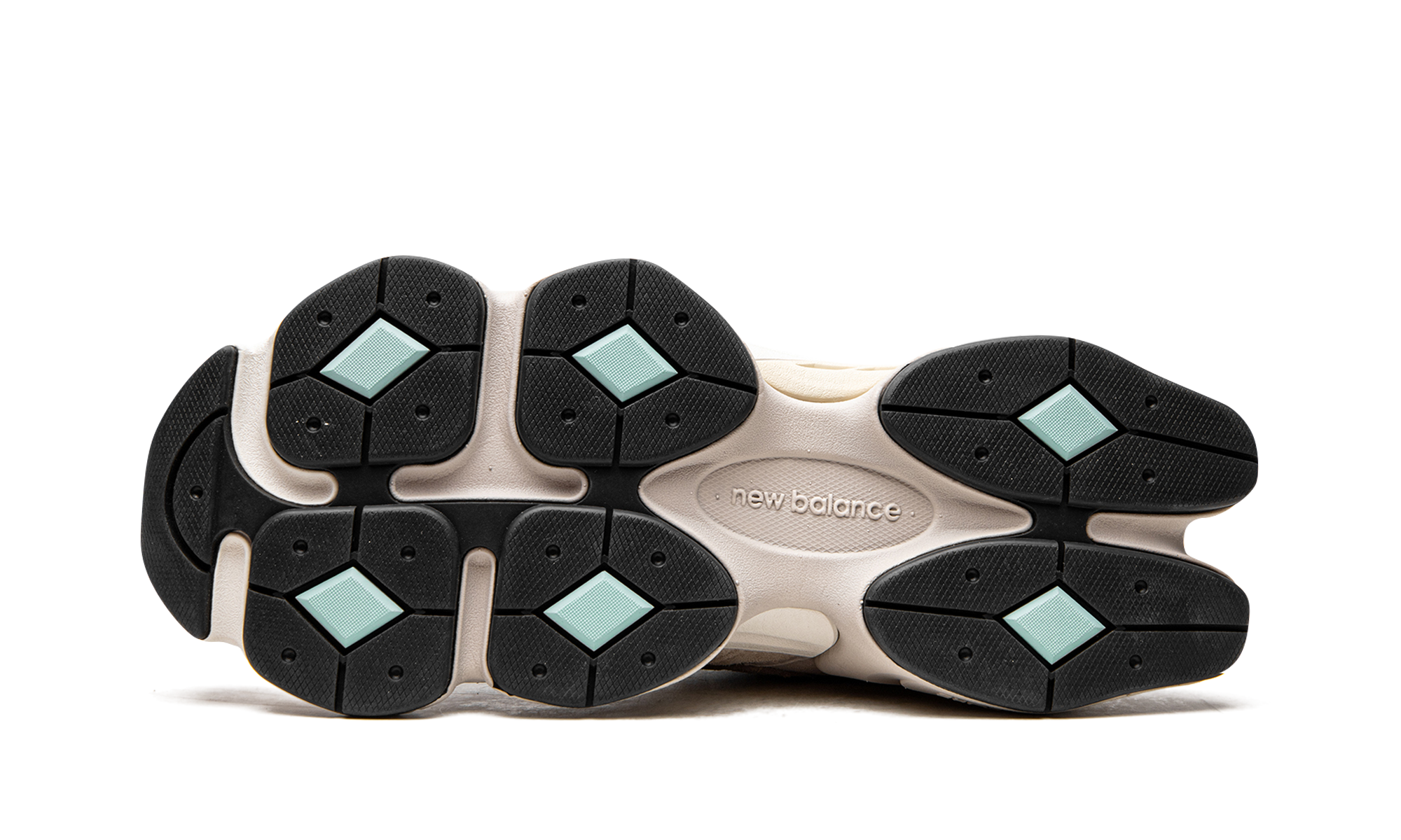 O design minimalista é complementado por elementos de branding subtis e um badge NB9060 azul contrastante na língua. A entressola marfim integra tecnologia EVA e ABZORB para conforto superior, enquanto a sola exterior preta garante aderência e durabilidade.