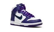 A parte superior em couro branco premium contrasta perfeitamente com os Swooshes azul-marinho nas laterais e os overlays roxo vibrante. A caixa dos dedos perfurada oferece respirabilidade extra, mantendo os pés frescos durante todo o dia.