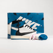 A paleta de cores, com couro de alta qualidade em branco, azul e preto, evoca as lendárias Fragment Design AJ1 de 2014. O design inclui o icónico Swoosh invertido de Travis Scott, enquanto os logótipos Cactus Jack e Fragment surgem gravados no calcanhar, destacando a exclusividade da parceria.