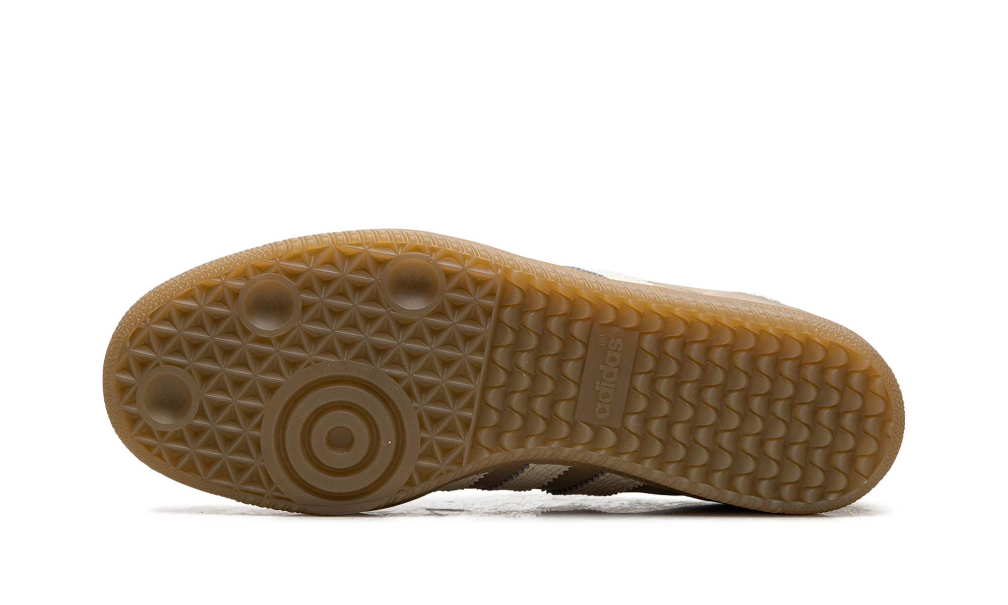 O design apresenta uma parte superior em pele num tom de castanho claro (Desert White), complementada por detalhes em camurça bege. As icónicas 3 riscas laterais e o calcanhar em camurça branca oferecem um contraste elegante. O forro interior em azul vivo acrescenta um toque de cor surpreendente, enquanto a clássica sola de borracha mantém o ADN inconfundível do modelo Samba.