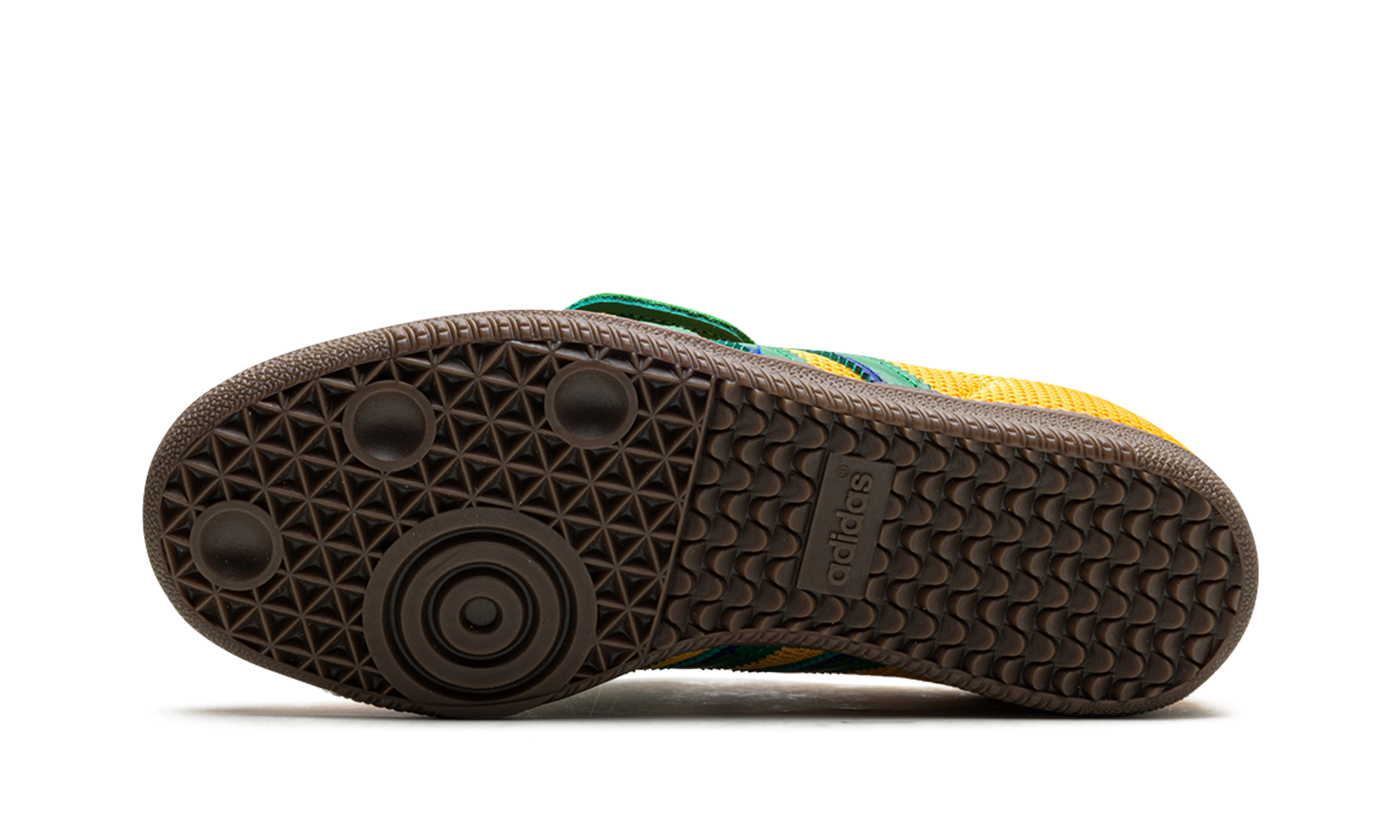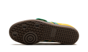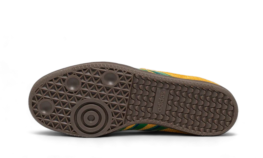 Confecionado com um topo em malha e camurça em amarelo, realçado pelas riscas adidas verde e azuis que se destacam em qualquer look. A língua oversized inspirada nas chuteiras de futebol cobre a zona dos atacadores, uma mudança ousada em relação ao design clássico das Samba.