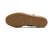 A parte superior em pele branca macia é realçada por sobreposições em Burgundy Red nas três riscas laterais e no calcanhar, criando um contraste vibrante. A biqueira em camurça bege e os detalhes dourados com a palavra "Samba" acrescentam um toque de sofisticação, enquanto a sola de borracha Gum completa o visual autêntico.