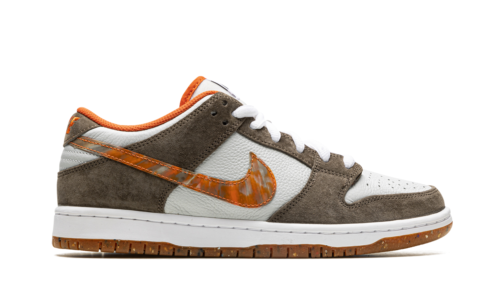 Em vez do texto habitual SB Dunk Low nas linguetas, encontrará a inscrição "Crushed D.C.", um detalhe exclusivo desta colaboração. As palmilhas são decoradas com grafismos inspirados em etiquetas de identificação, adicionando um elemento divertido.